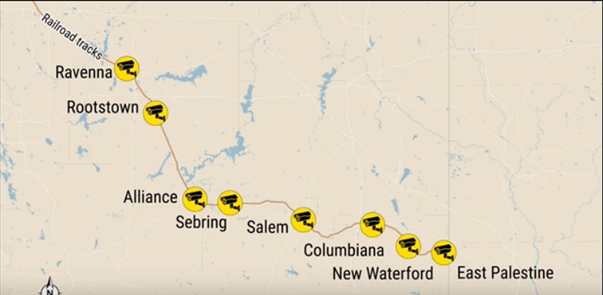 The satellite and radar images are timestamped in Greenwich Mean Time (GMT or Z). This equates to a timestamp of 02/04/2023 01:51:16 Z being February 3, 2023, at 8:51 p.m. The train derailed on February 3, 2023, at 8:52 p.m approximately 1/2 mile past the BLACK Radar Target.