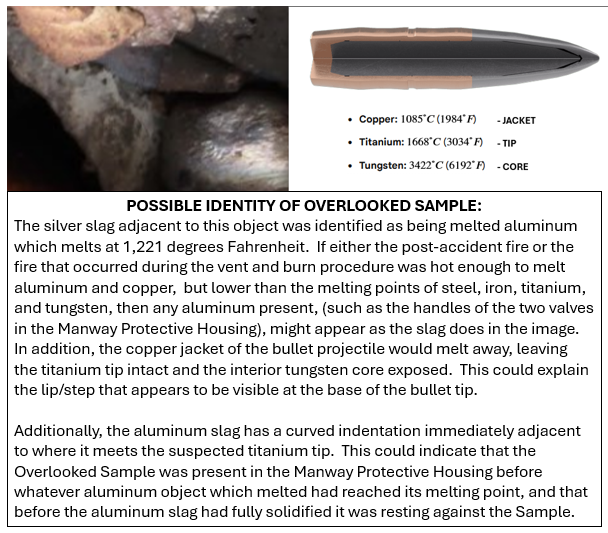 Below is the object that was intentionally blurred out in the photo above. The orange arrow on this NTSB Evidentiary Image, which was added by this author, points to a folded over area of the laboratory sample. To this author it has a striking similarity to a TITANIUM rod from an annular blast ring of the warhead of a Sidewinder Missile. A Sidewinder Missile was deployed the afternoon after the derailment to shoot down an acknowledged Chinese Spy Balloon off the coast of South Carolina.